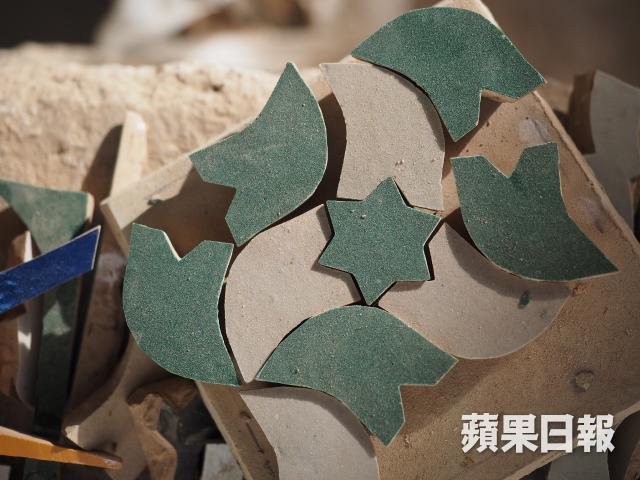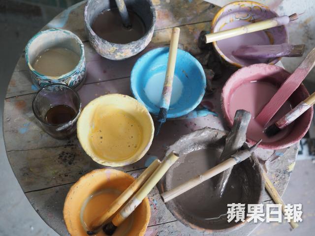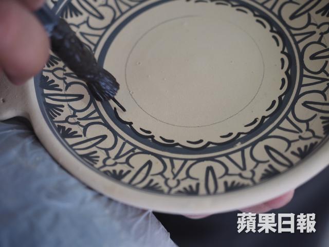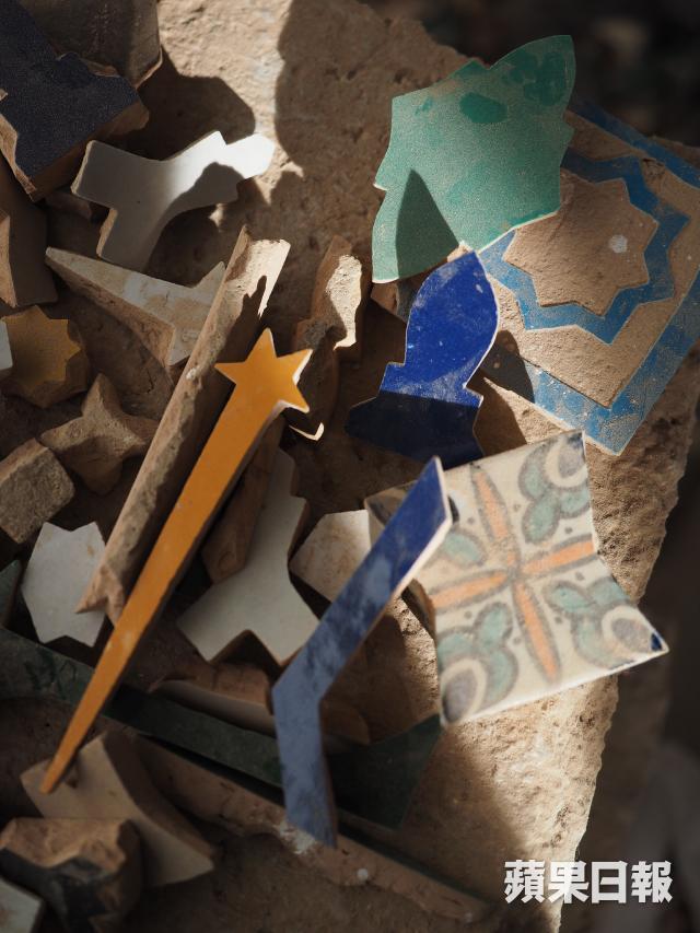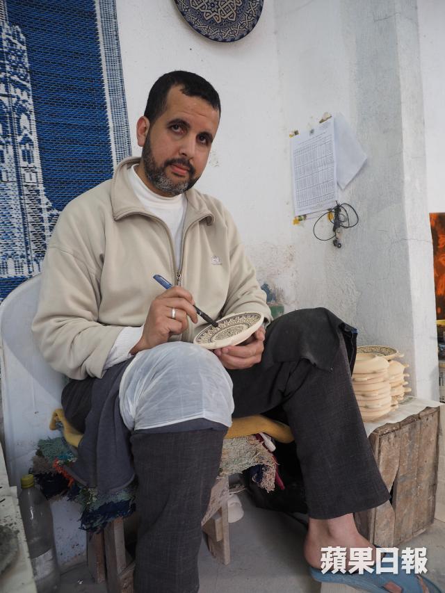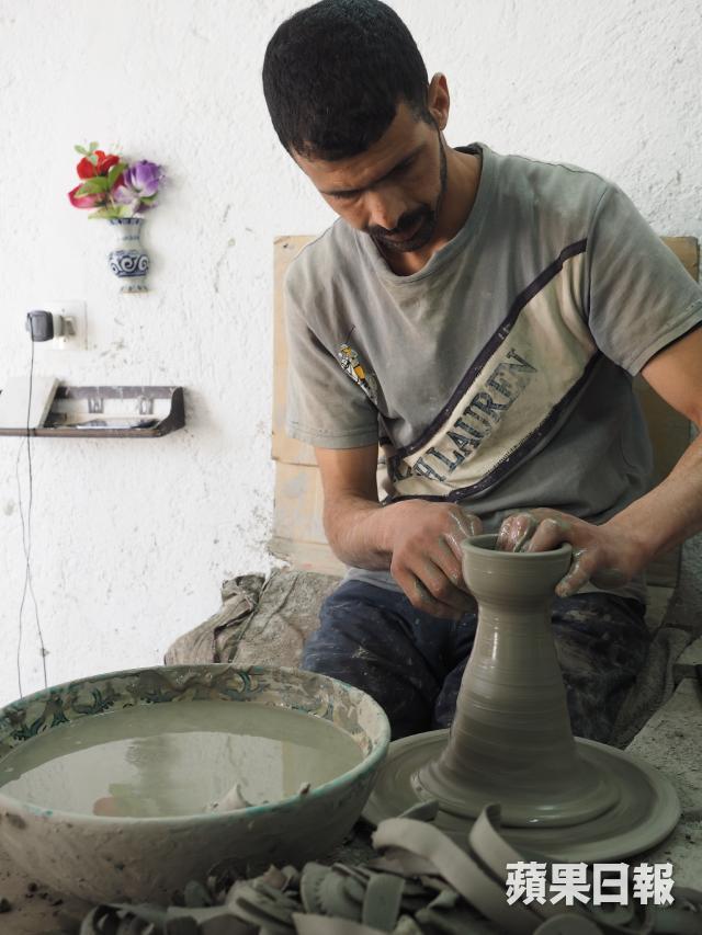 有關陶器上的花紋,原來都有區分,以幾何線條為主的花紋屬阿拉伯風格,色彩較繽粉而較多花朵圖案的則是巴巴爾人風格。Idriss是工場其中一位工匠,從父親學到這門手藝,一畫就是23個年頭,起初要依照圖樣畫圖,現在腦內已記載了超過1,000種不同圖案,不用臨摹或參考,隨手就能在瓷磚或陶器上繪畫。以為牢記複雜的圖案是最困難的部份,但原來學用圓規畫圖才是最難掌握的事,「單是熟習如何使用圓規畫圖就用了一年時間。」