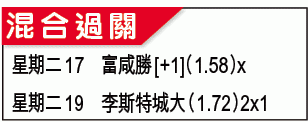 而另一場英聯盃,由英冠的富咸主場對史篤城,宜捧富咸[+1]「主勝」。富咸雖然上場聯賽輸波,三連勝告終,但近況總比開季未贏過的史篤城好;而且史軍上圈作客英乙的盧頓,竟然要踢到互射12碼才能晉級。文:咖喱