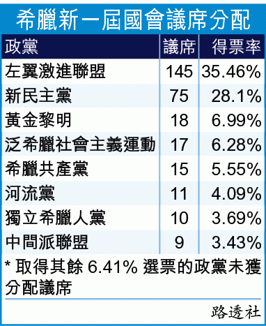 希臘前天大選有結果,由「左翼激進聯盟」以出乎意料的35.46%得票率勝出,明顯超越第二大黨新民主黨,但整體投票率為二戰後有紀錄以來新低。左聯黨魁齊普拉斯將再任總理,夥同右翼小黨「獨立希臘人黨」籌組聯合政府。