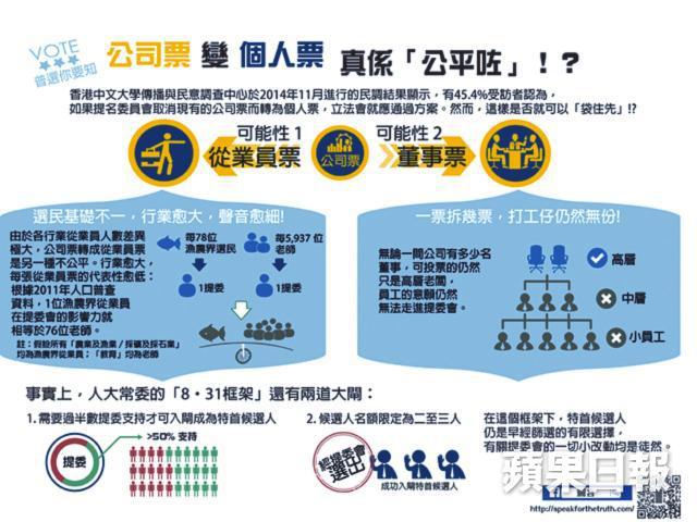他們是大學宿友,工作後年年7.1一起遊行,但行完又拜拜回家實在失落。多得去年財委會主席吳亮星夾硬通過東北撥款議案,這班老師、語言治療師、建築師、I.T.人無力感爆燈,開始動手把荒謬的政制以圖畫出,放上網隨便下載,也印成彩圖在佔領區免費派發後,好多人inbox他們作為後盾,幫忙搜資料的、畫圖的、計算的、到各區派發的都有,更多人給他們印圖送到佔領區,背後勢力是他們自己都想像不到的。