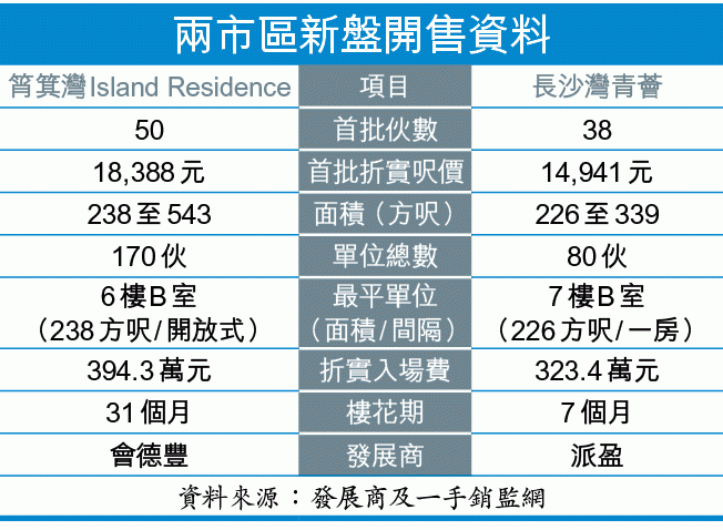 會德豐(020)筲箕灣Island Residence首批50伙,逾八成為開放式及一房戶,實用面積介乎238至543方呎,定價由477.9萬到1,229.3萬元。發展商提供多項付款辨法及二按計劃,當中印花稅津貼以600萬元為分水嶺,定價600萬元內單位可獲6%折扣,600萬元以上則提供7.5%折扣,累計最高折扣優惠分別達定價17.5%或19%。