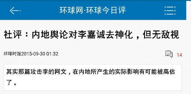 《環球時報》(下簡稱《環時》)昨以〈內地輿論對李嘉誠去神化,但無敵視〉為題發表社評,稱李嘉誠選擇回應的時間「可謂非常認真」,在習近平訪美後及國慶前夕。社評直指由新華社的「瞭望智庫」所轉發的〈別讓李嘉誠跑了〉一文在內地的影響可能被高估,而李嘉誠回應一篇網文亦不太尋常,表明李氏相當重視內地民眾對自己的看法。