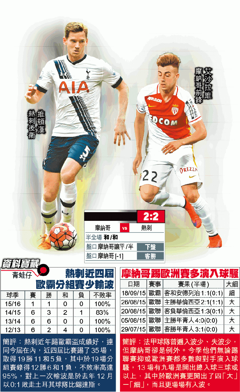 熱刺季初的表現尚算對辦,加上歐霸盃經驗極之豐富,預計會排出頗強陣容,周四作客到摩納哥進行J組第二輪分組賽,有力取得分數而回;「讓球」他們受讓平/半,下盤博得過。(球賽編號:星期四6;now670台明日1:00am直播)來自英超的熱刺乃歐霸盃常客,今屆更是他們連續第五年參賽,其中對上三屆均能從分組賽出線,而且於分組賽只輸過一場。雖然他們要到九月中才打開今季的勝利之門,但整體而言表現算不俗,九場比賽取得四勝三和兩負,當中包括於上周六主場反勝曼城4:1。