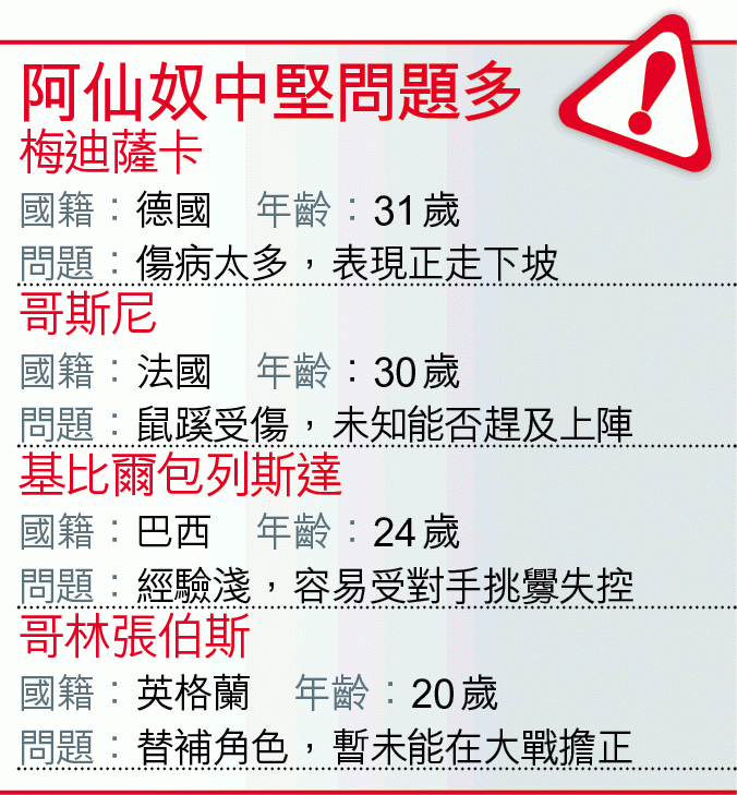 若說車路士的後防今季急劇退化是球隊表現不濟的源頭,藍戰士的同巿敵人阿仙奴何嘗不是呢?在周二主場不敵奧林比亞高斯的歐聯分組賽中所見,兵工廠中路防守同樣甩漏甚多,賽後更傳出中堅哥斯尼受傷,或難在下周日英超大戰曼聯中候命,相信領隊雲格會很頭痕。