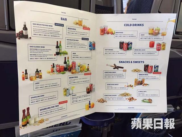 當日下午3時由斯德哥爾摩準時起飛,翌日一早上7時10分抵港,比原先7時25分早到。飛機採用A330舊機所以沒大期望,2-4-2排座只有大半滿,一人平均可佔兩個座位睡覺,幾舒適。只是座位沒有USB插頭,前方椅背電視屏幕如iPad mini般大小,左邊設揭蓋式鏡子見心思,長途機沒有amenity kit派發。空中服務員不及其他歐洲航空的媽媽級,僅屬成熟穩重型,服務周到,笑容可掬。要注意SAS跟市面航空公司不同之處是不設免費酒精飲品,飛機餐只提供一杯非酒精類飲品,啤酒、紅白酒及雞尾酒一律收費,座位前設有menu,一罐嘉士伯港元$47、小瓶紅酒$94、Gin Tonic或Bloody Mary$94,識飲必飲丹麥手工啤名牌Mikkeller,每罐$70,放心!水是源源不絶供應,入座時每人一瓶,中途亦不時派水。