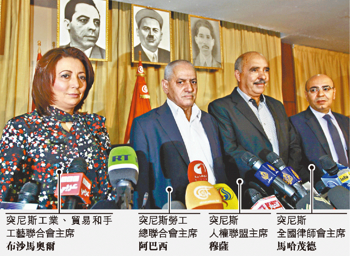 時值伊斯蘭復興運動黨(Ennahda)勝出大選,企圖修憲將伊斯蘭教定為國教,並限制言論及集會自由,反對派發起街頭示威,爆發暴力衝突。四個組織及時成立對話平台,推動了解決危機的政治進程,雖然談判多次瀕臨破裂,幸最終能排除萬難,成功在談判桌上說服執政黨簽署民主路線圖,更於去年底在新憲法下產生首位民選總統。