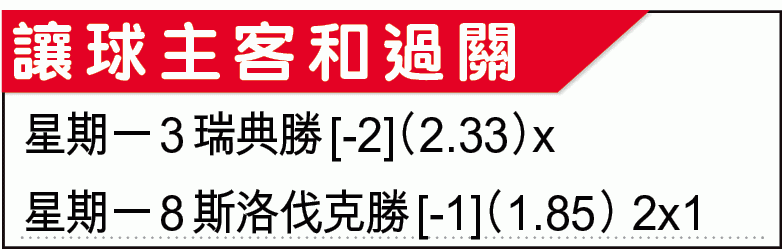 在C組排第二位的斯洛伐克,周一作客盧森堡時勝出就可出線,加上球隊剛於上仗在主場爆冷不敵白俄羅斯,主力如中場咸錫及後衞史卡迪爾等相信會打醒十二分精神,務求以大勝來出線,故可直取斯洛伐克[-1]的「主勝」。