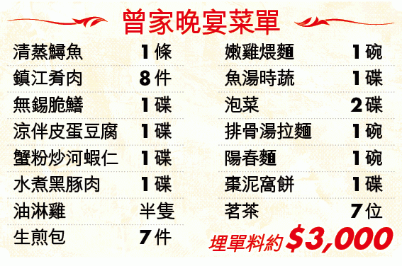 曾氏兄弟向來識飲識食,據了解,當晚的菜式中,包括價值1,080元的清蒸鱘魚,另外亦有鎮江肴肉、無錫脆鱔以及時令的蟹粉炒河蝦仁等10道菜。至於鎮店招牌拉麵,曾家亦分別點了排骨湯拉麵和陽春麵兩款,再以甜品棗泥窩餅作結。據知一行七人的晚飯,最終由曾蔭培請客,以約3,000元埋單。