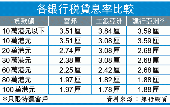 另外,工銀亞洲今年最低稅貸實際年利率為1.78厘,暫時為全城最低,但只限100萬元或以上的大額貸款,貸額上限則增至200萬元。