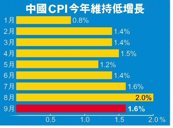 中國國家統計局公佈,9月份CPI按年上升1.6%,較8月份(升2%)有所回落,亦低過按年升1.8%的市場預測。分析指,由於暑假天氣理想,國內豬肉、蔬果價格平穩,整體食品通脹只增加2.7%;而非食品通脹僅升1%,創出5個月新低,進一步拉低整體通脹。