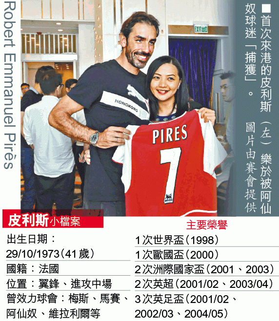 隨英超大師隊來港的前阿仙奴靚佬球星皮利斯,日前應其贊助商Puma邀請接受本報專訪,席間談到阿仙奴今季有不俗機會重奪英超,又盛讚「山神」阿歷斯山齊士是頂級鋒將。這位前法國國腳又力撐國家隊是明年歐國盃奪標熱門,但球員需要克服主場作賽的壓力。