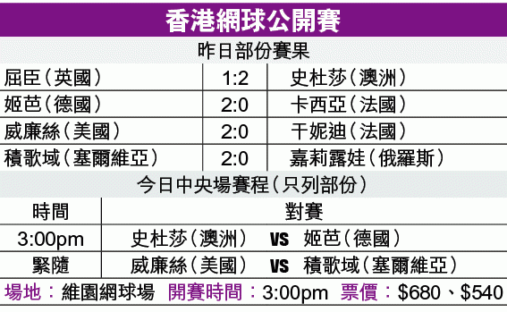 至於世界排名第10的德國球手姬芭,昨對戰22歲生日的法國球手卡西亞,一度被飛入場區的蝴蝶嚇怕,但最終仍以7:5、6:4擊敗對手,今日將與31歲老將史杜莎爭入決賽;後者昨面對英國的屈臣,以4:6、6:3及6:0反勝晉級。
