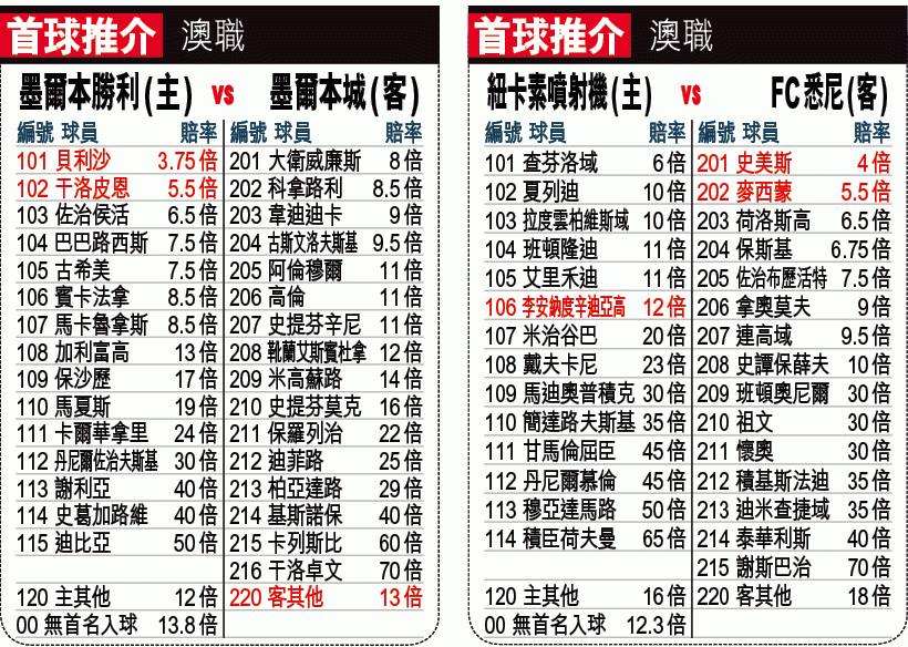 周六澳職上演墨爾本打吡,由墨爾本勝利迎戰墨爾本城,由於勝利今役有主場之利兼有隊長卡爾華拿里復出,料可以打開今季聯賽勝利之門;「讓球」勝利讓半/一,捧上盤。(星期六8;有線64及203台今日4:30pm直播)