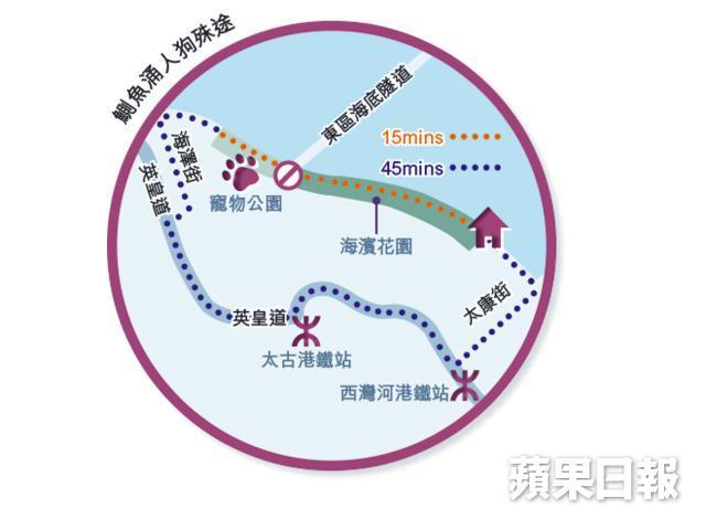 家住筲箕灣的Jackson,經常帶Timber到鰂魚涌海旁的寵物公園散步,從住處出發,逕直穿過兩個海濱花園便到達,路程不過15分鐘。然而,海濱花園是康文署管理的公園,規定狗隻不得內進,於是Jackson曾拖着Timber繞過海濱花園及同樣禁犬的太古大廈,途經數條馬路,在人來人往的大街中穿插,足足花了45分鐘,人狗均已疲憊不堪。自此,這位主人鋌而走險,把海濱花園視為捷徑,匆匆走過。今年8月他再途經禁地,冷不防被一名釣魚人士報警投訴,「警察抄下我的身份證號碼,並說康文署會發告票。」這類案件大多罰款了事,Jackson卻堅持不認罪,還準備對簿公堂,單是律師費已動輒上萬元,眼前人坦言這是一場為寵物爭取權益的革命,「不僅關乎犬隻能否進入公園,而是需要大家反思,人與動物為何不可共享公共空間?」