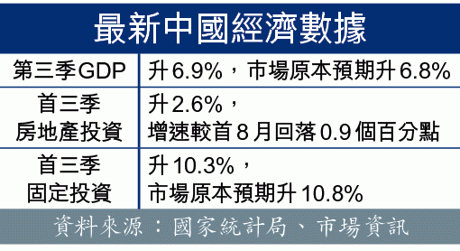 今年首三季GDP為48.78萬億元人民幣,若分季度看,第一、二季均增長7%,第三季度增長6.9%。期內工業持續不振,9月工業增加值按年增長5.7%,較8月回落0.4個百分點,亦遜於市場預期增長6%;今年首三季的固定資產投資亦持續下滑,按年增長10.3%,遜於市場預測增長10.8%。