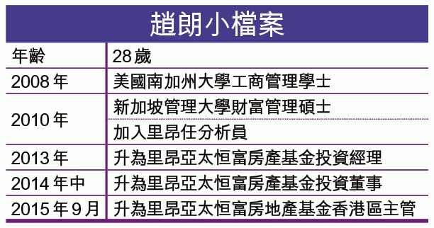所謂虎父無犬子,長實地產(1113)樓神趙國雄認真飲得杯落,佢28歲嘅阿仔趙朗(Ronald),加入里昂證券5年左右,不斷升職,早排又升,近3年每年升一次,最新職銜係里昂亞太恒富房地產基金香港區主管,睇晒成個香港地區嘅房地產投資項目。