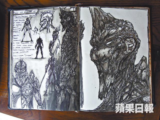 那段被禁錮的折磨歲月,他喜歡觀察自己的身體,觀察血管和肌肉,「若非如此,九年來比坐牢更痛苦的生活如何過?」所以,他的畫風很黑暗、有歌德式風格,「畫風很混雜,跟我成長的深水埗一樣。」筆下所畫的人物,不是在籠牢裏被焚燒的人,就是誓要消滅地球的那個惡魔,刻畫得像在沙漠裏要把人吞噬似的。他的筆觸好重,同一線條又不斷重複地畫上一筆又一筆,就像要用筆尖畫破紙張。看他的畫,未必明白他每幅作品的含義,但你會不禁用指尖,以不能再溫柔的力度輕撫那又深又長的筆痕,感受他那悲憤交集的宣洩。