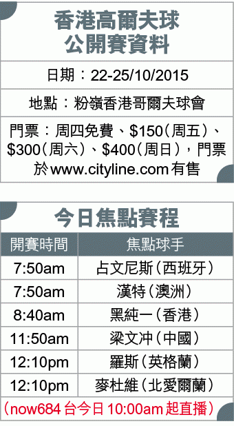 世界排名第七的英格蘭球手羅斯,以及世界排名第八的美國名將莊遜,將於今午12時10分同組出賽。至於周日剛於澳門公開賽封王的澳洲球手漢特,今晨7時50分就會與占文尼斯及泰國球手贊弟同組開賽,力爭衞冕。前者表示:「澳門奪冠絕對是一個好兆頭,但粉嶺場地與澳門不盡相同,希望可放低衞冕的包袱,全力爭取好成績。」