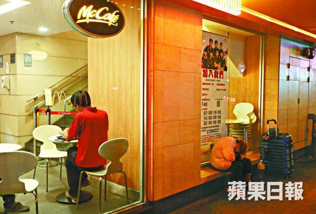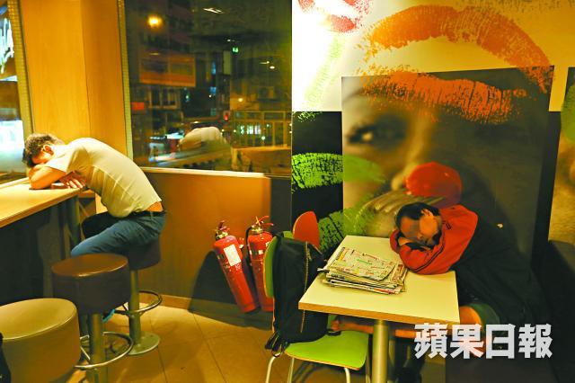 半夜三更,沿着樓梯登上2樓,麥當勞收銀機前空無一人,職員兩眼放空,心神不知飄向何方。用餐地帶在餐廳兩端,才踏進一步,就不禁反問自己是否誤闖別人的寢室:褐色長梳化變身睡床,斗室內躺上10多個麥難民,衣衫單薄的人不勝寒氣,雙手交叉抱胸,或勒緊外套入睡,又或者如巨型壁畫前那對「連體嬰」般相擁熟睡,以心頭上的暖意抵銷獨身的孤單感。
