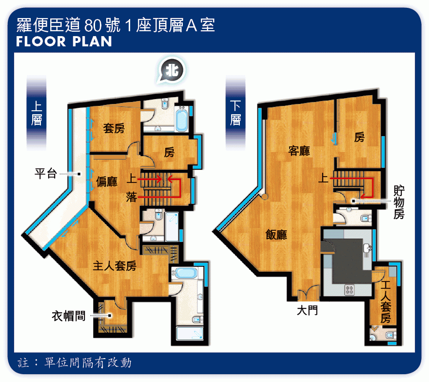 參觀的是1座頂層複式,發展商已將內櫳全面翻新,間隔上進行少量改動,包括下層書房門位擴闊,上層主人套房原有大型衣帽間拆牆改建曲尺衣櫃,原有貯物房化身小型衣帽間,上層套房加建一列三角形貯物櫃,拉直原有斜角牆身。單位上下層合共四間房,第五間設於天台。各層向東享有明信片級維港兩岸景色,向西南則以西半山較高地勢一帶遠景為主,觀感開揚。