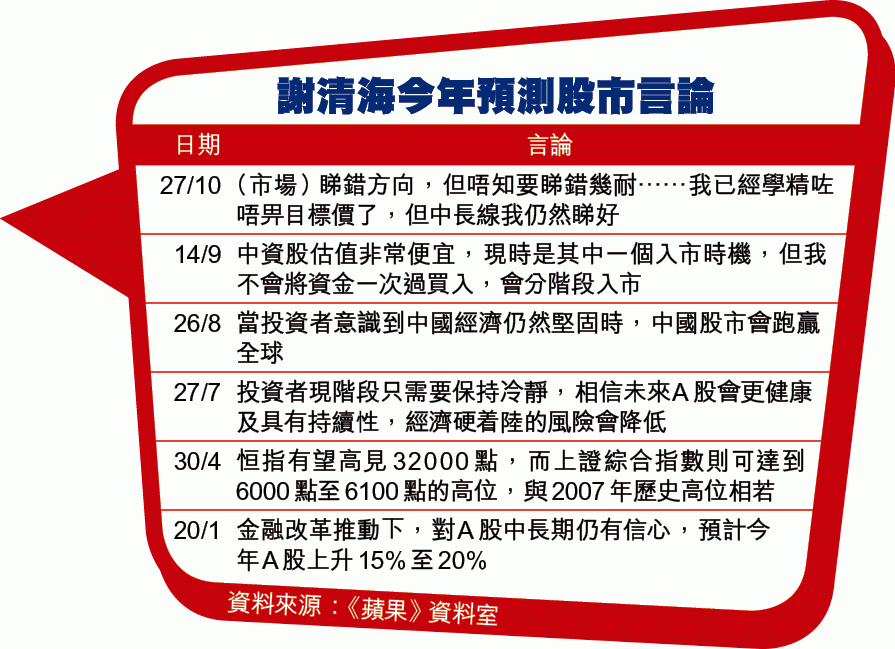 今年以來謝清海對於中港股市一直樂觀,4月時更曾估計恒指高見32000點、上證指數見6000點(見表),股災後更認為是股民入市良機,不過今天他與以往較樂觀口徑有異。曾一度估A股今年重見2007年高位的他,直言不再給予目標價,「我講的只係我大致對市場嘅感覺」。