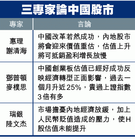 謝清海解釋,中國改革若然成功,內地股市將會迎來價值重估,估值上升將可抵銷盈利增長放慢。