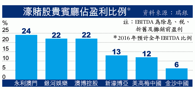 據瑞銀早前發表的報告,一眾濠賭股中,貴賓廳業務佔EBITDA(除息、稅、折舊及攤銷前盈利)比例預計最高的是永利(1128),達24%,其次是銀娛(027)及澳博(880)(見圖),新濠博亞則為13%。《信報》日前報道,新濠峰內由集美經營的新濠峰國際會,因受早前多金貴賓廳「穿櫃桶底」事件影響,出現客戶提款潮而於前日結業。