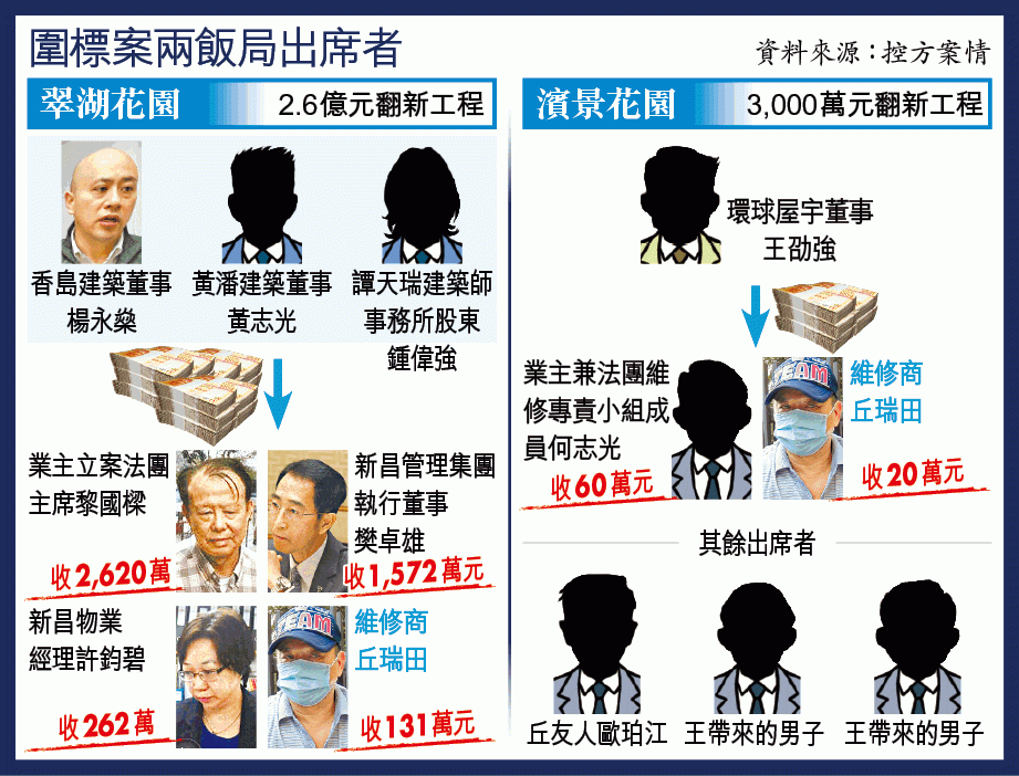 另3項涉及翠湖的控罪發生在2010至2014年,指丘串謀翠湖法團主席黎國樑、新昌管理執董樊卓雄、新昌物業經理許鈞碧、建築師事務所股東鍾偉強、香島建築董事楊永燊及黃潘建築公司董事黃志光,向黎、樊、許及被告提供報酬,以總工程費用百分比計算,給黎10%(2,620萬元)、樊6%(1,572萬元)、許1%(262萬)及被告0.5%(131萬元),作為協助鍾、楊及黃取得顧問及工程合約的回報。