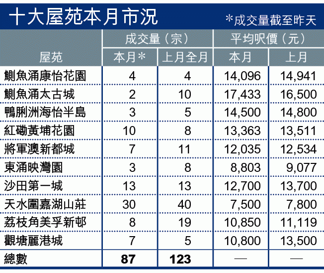 上述數據反映兩至四星期的市況,而本報統計的全港10大屋苑,本月截至昨天錄87宗買賣,多達7屋苑仍是「單位數」,其中鰂魚涌太古城最慘淡,已連續11天零成交,本月暫只有兩宗買賣,是屋苑自1980年入伙以來的35年新低。