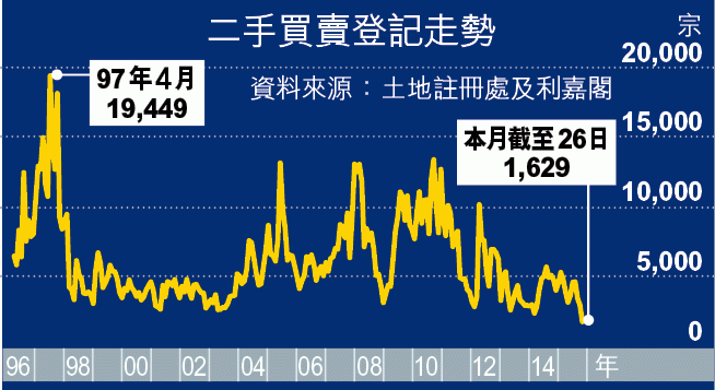【本報訊】全城等樓價跌,少人敢買二手樓,樓市交投氣氛衰過沙士。有物業代理行預測,全港本月二手樓宇買賣料僅約2,000宗,按月跌近三成,創1996年有紀錄以來歷史新低,比辣招及2003年沙士時期更慘情。