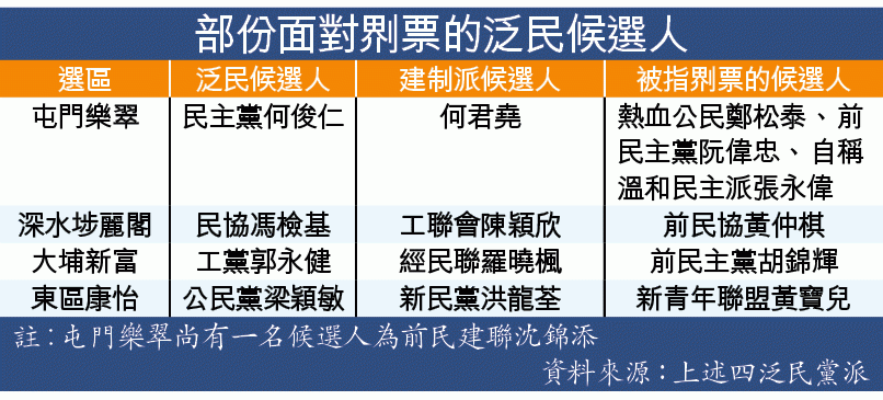 被泛民指𠝹票的參選人,多有泛民背景甚至是前泛民政黨成員。民協李健勤說:「以前嚟𠝹票係扮民主派,選舉前冇見過,選完就唔見人,今次就有民主派背景……」他舉例指,民協譚國僑選深水埗南山、大坑東及大坑西選區,主要對手是西九新動力韋海英,前民主黨、前民協及前人民力量的符偉樂卻空降該區參選。另外該黨馮檢基在深水埗麗閣競逐連任,被工聯會陳穎欣狙擊時,前黨友黃仲棋亦出戰。