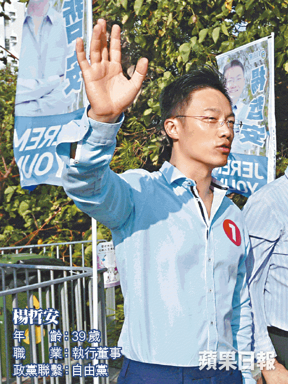 楊哲安強調一年前已任自由黨南區支部主席並在此區服務,重申居於薄扶林是其優勢,有任何事故可第一時間趕至處理。他指自己是香港人兼懂廣東話,或更易與不諳英語的居民溝通,又指與司馬文政治立場不同,反對以佔中手法爭取普選,重提司馬文去年在國慶酒會舉黃傘,「根本幫唔到件事」。