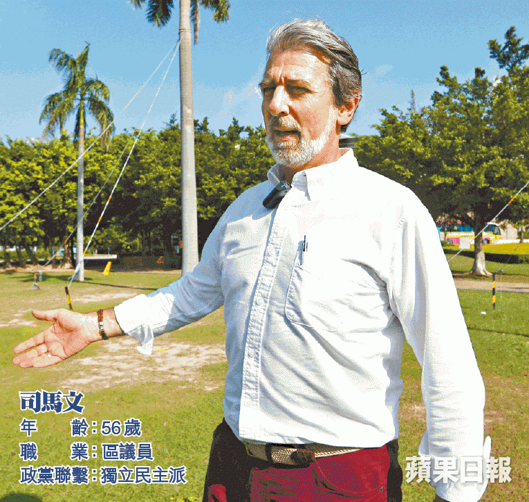 上屆以逾600票力壓對手勝出的司馬文雖沒政府工作背景,卻深信了解政府運作,強調自己與任何階層政府官員亦有緊密工作聯繫,重申任內專注地區工作,既辦民調、發佈工作報告也接見居民,相信是今屆致勝關鍵。他並指楊哲安不活躍於社區,「從未在區內見過他(I've never seen him)」。