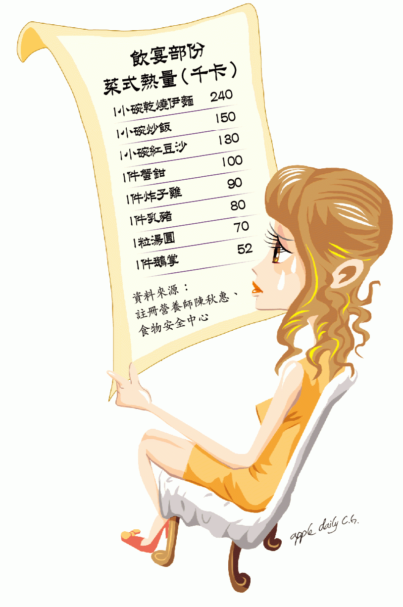 陳說,成年女性每日從飲食攝取1,500千卡,晚餐平均攝取600千卡,若抱着「唔蝕底」心態,在一餐飲宴期間狂食,隨時可攝取1,800千卡(即額外攝取1,200千卡),一個月出席3次飲宴,即多攝取3,600千卡,若以一般額外攝取3,500千卡,便增加一磅脂肪計算,換言之,飲3次有機會增加一磅。