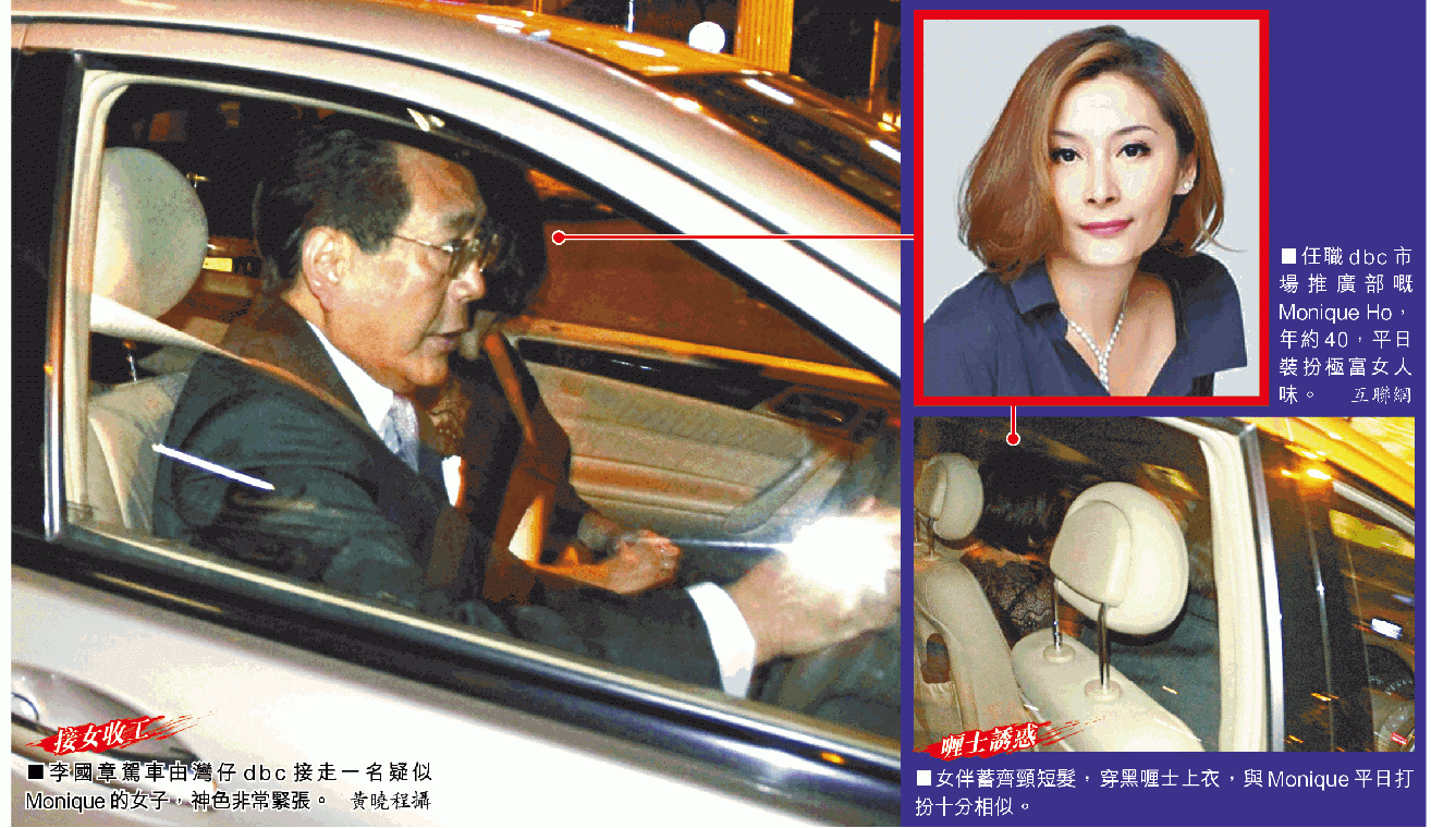 雖則被傳媒爆出「父女戀」,但李國章似乎冇受影響,噚晚7點10分左右,李國章不避嫌咁駕車直駛入dbc位於灣仔告士打道3號嘅大廈停車場;唔夠兩分鐘,佢已經接咗女伴上車,女伴穿住黑色喱士上衣,明顯十分避忌,一直耷低頭,而佢髮型同體形,同報道中嘅Monique極為相似,都幾有可能係同一個人。