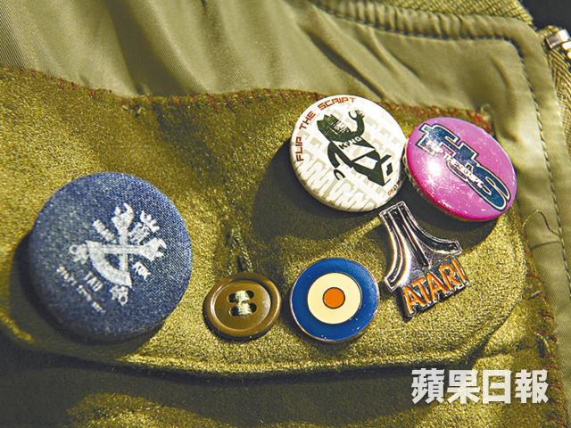 Treeman說自己很喜歡貼紙及徽章,有時也會釘在外套上,他不是徽章收藏家,但襟上的圖案,都有其意義或回憶。「Target圖案是英國Mods文化的標誌;Atari是童年時經典的遊戲機;flip the script徽章則是以前玩滑板的回憶。」他說近年很多時裝品牌大玩八、九十年代元素,徽章成為一種潮流文化,「它未必是很有訊息的東西,有時純粹覺得漂亮。」二十多年前Treeman也喜歡聽龐克音樂,覺得很有型很有態度,穿衣風格也很signature,他說自己受Sex Pistols形象的影響比音樂大。「每個年代,年輕人的表達方式都不同,當他們走出來控訴社會時就要有一種態度,六十年代的Hippie會在海報上寫“Make Love, No War”,七十年代slogan tee的文化尚未流行,一些人就在皮褸別上徽章顯示自我,結合音樂去表達訊息。」八十年代後流行slogan tee,演變至今其意義也已改變,正如當初的徽章一樣。