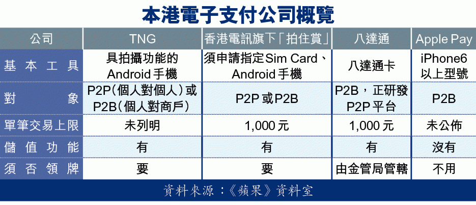TNG電子錢包支付及轉賬採用二維碼(QR Code)認證,即假設輸入銀碼100元後,二維碼將會出現10秒,由商家以器材掃描即完成付款。這類儲值支付工具與早前香港電訊(6823)推出的「拍住賞」相近,同樣屬銀行以外的非實體支付渠道,並且具有儲值、支付、P2P轉賬等功能,在支付條例昨日三讀通過、待正式刊憲生效後,這些公司需要12個月內向金管局申請牌照,並須承擔資本要求及刑事責任(見另文)。