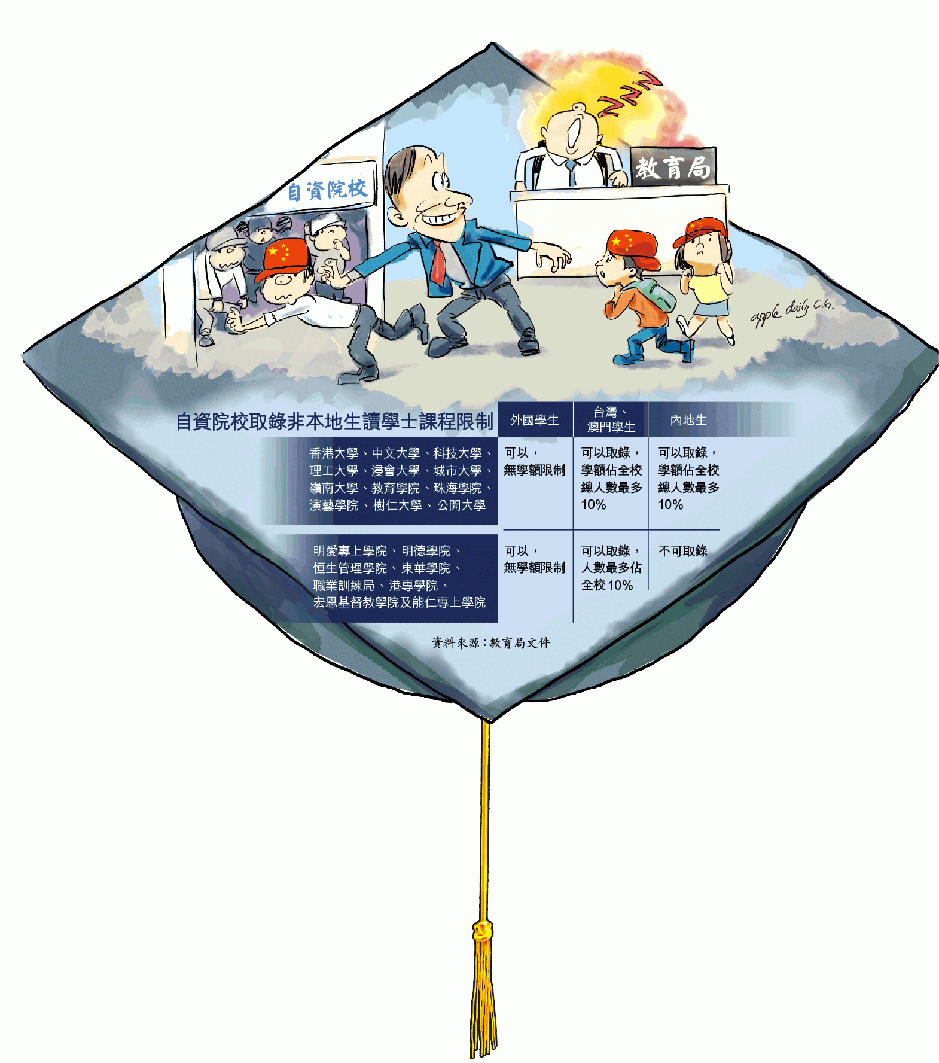 教育局上月23日發信予自資專上業界,信中提及早在去年1月已通知業界,自3月中就收生安排實施微調。因應業界對取錄非本地生入讀自資全日制經評審本地學士課程有着不少疑問,局方整理後發信釐清具體安排。信函指出,根據與內地教育部協議,在現有20間自資院校當中,只有12間院校可取錄內地生入讀自資學士及碩士課程。不入名單的8間院校,均是近年根據《專上學院條例》(第320章)註冊的院校,其註冊時間在協議簽訂之後。