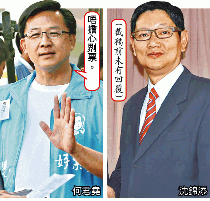 本報上周向沈錦添發facebook短訊邀約訪問及回應何君堯言論,至截稿前未獲回覆。該區其他參選人包括民主黨前成員阮偉忠及報稱無政治聯繫的張永偉。