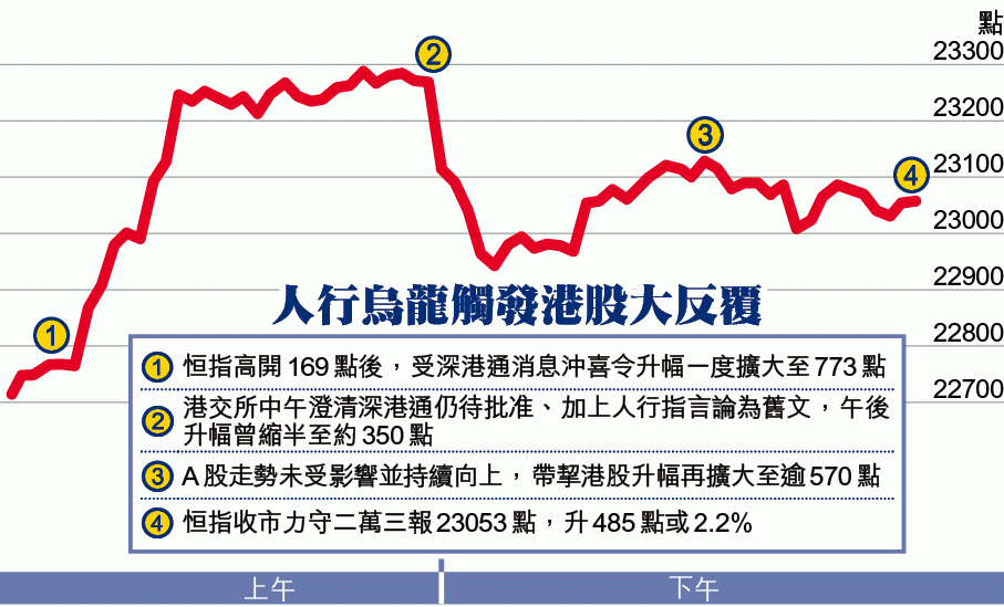 【本報訊】人行大整蠱,但中港股繼續炒!人民銀行昨現笑話式烏龍,周二下午在網站刊登行長周小川指今年開通深港通的文章,影響力昨早發酵並觸發中港股瘋炒,但午後澄清是重發5月舊文後,曾令恒指升幅縮窄,惟A股續呈強,帶挈港股埋單仍錄約一個月最大升幅,成交逾千億元;有分析更指市場過份興奮。