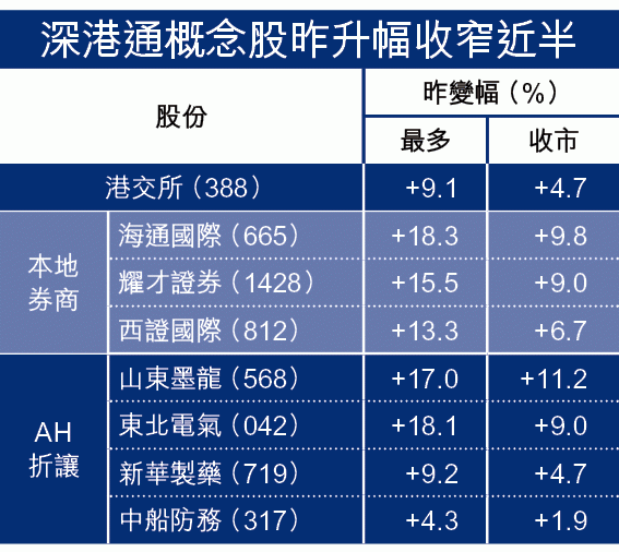 深港通今年開車傳聞一出,即重燃資金入市意欲,恒指昨高開169點後,一個半小時內升幅曾擴大至773點;中午休市時港交所(388)發公告指政策仍有待批准,同時人行網站提醒文章為舊文,令恒指午後升幅迅速收窄一半,多隻概念股如港交所升幅由近一成收窄至4.7%;本地券商股回軟,曾升逾18%的海通國際(665),收市升幅縮至9.8%;山東墨龍(568)及東北電氣(042)等大折讓AH股升幅亦減半。
