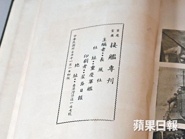 重慶號1948年7月抵達香港,停泊期間,在香港印刷《重慶靈甫接艦專刊》,印刷者是「星島日報」。這本《接艦專刊》類似同學錄,由艦上軍官充當編輯,記載了船員生活點滴、受訓經過、艦隻系統配置等,並附有大量圖片,跟四十年代的書很不一樣。Kelvin喜孜孜地說,此書資料詳盡,載有完整的官兵資料,甚至有前英國首相邱吉爾探望船員的珍貴照片,對研究中國海軍歷史意義重大。