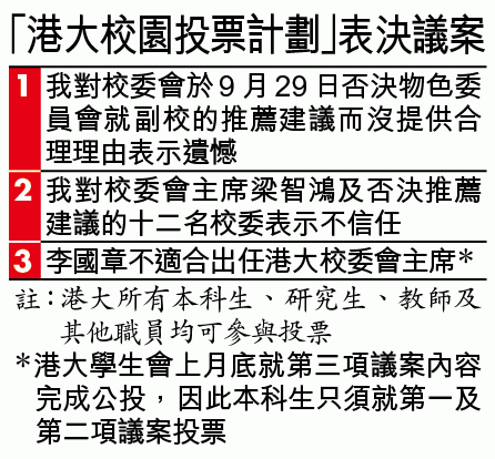 【本報訊】港大校委會主席人選料今天凌晨出爐。繼港大學生會上月舉行本科生公投後,港大教師及職員會與校友關注組發起港大校園投票計劃,下周一至五將在校園再度舉行公投,今次對象擴大至全校約3.5萬名本科生、研究生及所有職員,就校委會否決陳文敏任副校等多項議題表態,包括熱門人選李國章是否適合擔任校委會主席。擔任公投技術支援的港大民研計劃總監鍾庭耀直指,當制度失衡,當權者有權用盡,此項投票計劃尤其重要。