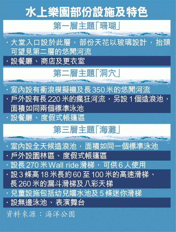 新水上樂園昨舉行動土儀式,料2018年下半年竣工。樂園位處大樹灣原集古村,佔地逾69.3萬平方呎,面積較舊樂園大兩倍,標榜是全東南亞首個及唯一一個臨海水上樂園,環抱南中國海。樂園依山而建,採用梯田式平台設計,共分3層,分別以珊瑚、洞穴及海灘為主題,各設不同設施。