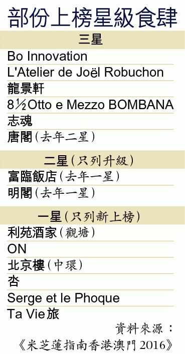 2016年米芝蓮指南中,今年6間獲選最高榮譽的三星食肆,全部由高檔餐廳壟斷,如法國菜L'Atelier de Joёl Robuchon、日本菜「志魂」壽司等。富臨飯店、明閣就由一星升上二星。另有6間食肆首次登上一星食肆名單,如中環北京樓。