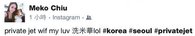 Meko恃着得到洗米華「點燈」,前日傍實他出發到韓國首爾參觀新賭廳,此行還有劉浩龍和鄧麗欣到賭場登台,可以登上私人飛機的Meko得戚拍照,上載Ig晒命:「Private jet wif my luv洗米華」,相中男子背影正是洗米華,他與女助手傾談公事。Meko同時又貼出另一張洗米華正面相,估計當時眾人在候機室等候登機。不久Meko把洗米華正面照鏟走,又將私人飛機照片的留言改為「Private jet lol」,洗米華慘被「delete」。Meko新歡身份昨午見光即死,她立即把Ig私人飛機照刪走,同時賬戶先關閉後取消。昨午5時許,Meko又突在fb留言澄清與洗米華神秘關係:「其實我係陪朋友參加咗呢個飛(非)凡遊之旅,今次才是第一次認識華哥,華哥係我偶像,大家唔好誤會!」如Meko所言,首次認識洗米華便可獲優待同坐私人飛機,足見洗米華對她另眼相看。