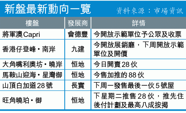 嘉里(683)屯門新盤滿名山繼續收票,市場指該盤兩日共收約500票。會德豐地產將軍澳Capri今日將開放示範單位予公眾參觀,並展開收票工作。