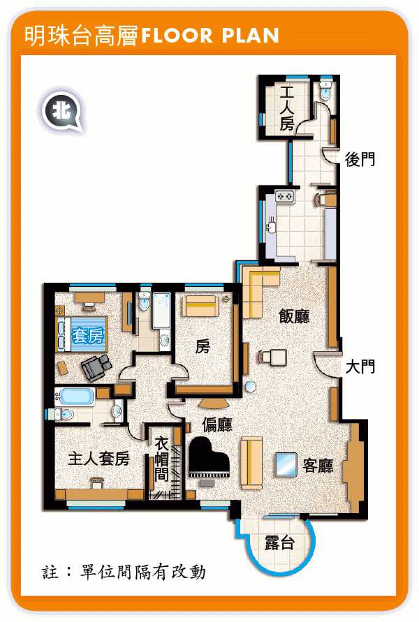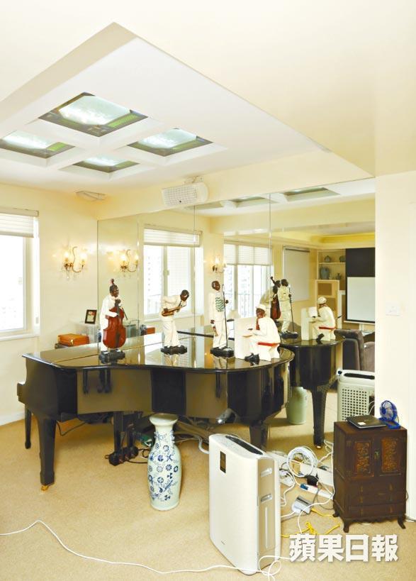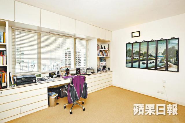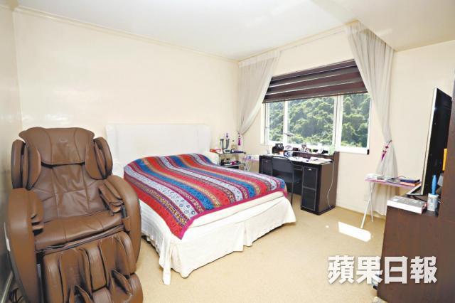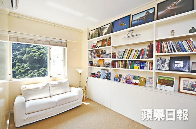 單位原則四房改三房,客廳旁原有睡房拆牆闢作偏廳放三角鋼琴,令原本已經巨型的大廳顯得更加空曠。同樣座向東北的主人套房附設衣帽間,現時只作為書房用途,休息空間是座向西南的套房,翠綠山景下更加怡神。旁邊另一間向西南的長形房則是閱書閣,窗前放張大梳化,可以悠閒安靜地看書。