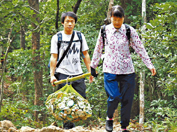行山人士絡繹不絕,除店前堆砌了一座鋁罐小山,店後亦有一堆。會社民工工作室、泛非龍青山綠水行動組織37位義工,上山運走鋁罐,14,000個鋁罐重達181.55公斤,要用擔挑一步一步抬下山。負責義載的回收商指,鋁罐會分送給拾荒婆婆,自己不賺分毫。