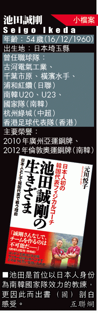 54歲的池田教練是球員出身,曾在1986年助古河電氣工業捧走亞冠盃,可惜在29歲時傷及十字韌帶,被迫掛靴。雖說傷病是運動員天敵,但他卻因而對運動科學產生興趣,之後在日本、意大利等地學法。2009年,他獲南韓國家隊教練洪明甫邀請,以體能教練身份隨「太極虎」備戰世盃決賽周,兩年前再轉職到中超球隊杭州綠城。